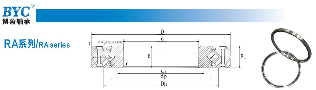 Series IntroductionRA thin type is a small and light weight bearing with a very thin wall thickness. It carries heavy loads. Therefore, the bearing housing and pressure flange can be light weight. It is being used in rotary locationss such as in robot hands. The outer rings of the RA thin type are separable and fixed by special rivets.